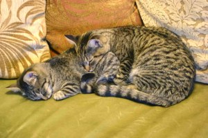the world that is Clintonville stroll by our front door. If the weather’s nice, we let our cats outside, too, to watch the birds, squirrels and bumble bees flutter around. We have four cats: Fionula, Seamus, Maeve, and Ciara. Got a Celtic thing going on with the names. That’s Maeve and Seamus in the picture.