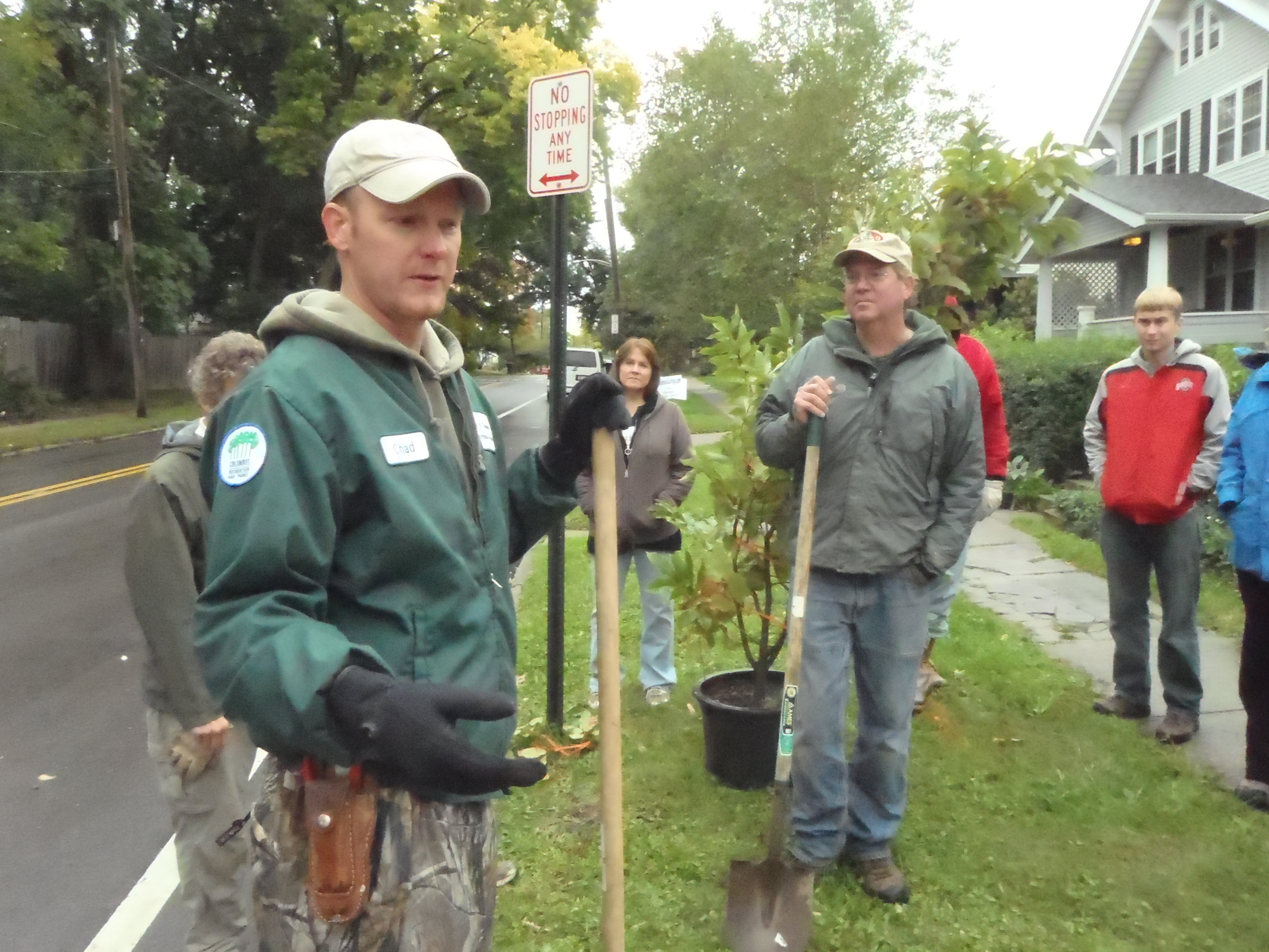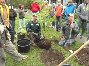 perfect cold, damp, and rainy weather (that is, if you were a human, not a tree going into the ground…) to help us out. A very special thanks goes out to Chad, from the City of Columbus and the OSU students who came out in great number (and to Laura Fay for finding us all of those students). Chad showed everyone how to plant the trees, and the OSU students, along with the other volunteers, went out and got it done. It was so wonderful the next day to go about in the Arboretum and see all the newly planted trees. Of course, the whole process went so smoothly because of all the pre-planning done by Mike McLaughlin. He made it so we could all be amazing, simply by being so amazing himself. And also, I’d like to thank Mike’s husband, Dan, for allowing us to take up so much of Mike’s time these past few months.