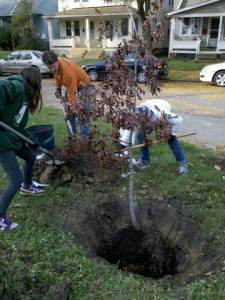 had another amazing turnout of volunteers. Again, thanks to all the OSU students who showed up over the past three weeks (and all the other volunteers) because we couldn’t have done it without you. (And the Buckeyes won to cap off the day!) I’m not certain on the exact count, but it’s over 150 trees that have been planted to date. Now, we will need to go back to check on all the trees to make sure they are being watered and trimmed and staked. I can’t wait to see how they take off next year. The oak planted in our tree lawn about three years ago has doubled in size, so I know that these trees will grow up fast, too. (I feel like these trees are all my children!)