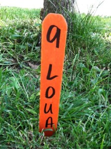 These are the temporary markers that are in front of the tree that is described in the tree walk. The number on the tag matches the number on the map. The real markers that we are waiting on will contain a lot more information about the tree itself: common name, scientific name, etc.