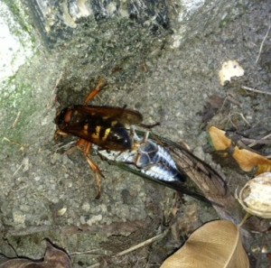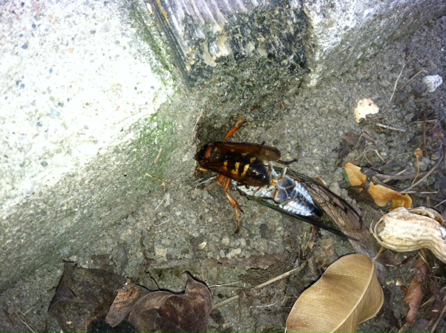 The other really cool thing that we experienced at Mike’s house was a cicada killer, a wasp that paralyses a cicada, drags it into a hole it’s made, lays an egg on the insect, then fills the hole back in. The egg hatches and feeds on the still-alive cicada. Kinda gross! But Pete says that cicadas harm trees, and the cicada killer is just doing its thing. I actually thought to grab my iPhone and take a video of the cicada killer flying around with the cicada. It’s pretty amazing when you look at the size difference how the cicada killer could even make it off the ground.