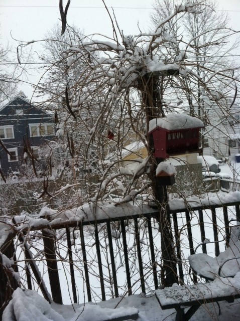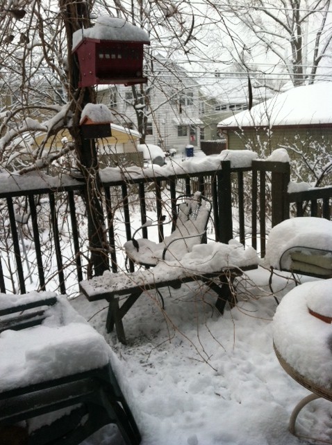 We have been feeding the birds for some time now, seeing mostly English sparrows and our cardinal pair; the male cardinal looks striking in the snow. (TIP: we microwave the sunflower seeds before we place them in the feeder so that the seeds won’t sprout come spring.) But Wednesday brought out a whole new set of birds, many that aren’t commonly seen at our feeder: juncos, cowbirds and our woodpecker, who was feeding on the suet. Pete said the cowbird was unusual because they prefer, well, places the cows would like, such as open fields. They are such distinct birds with a brown head and black bodies. And the juncos are very beautiful, too, with grey bodies and white bellies. And we always have chickadees, one of my favorites. I took some pictures, but the birds are small, the camera’s only my iPhone, so the pictures aren’t the best. The first photo shows Mr. Cardinal to the left of the bird feeder; the second shows the juncos on the chair below and to the right of the feeder. If you squint, you can barely make them out…