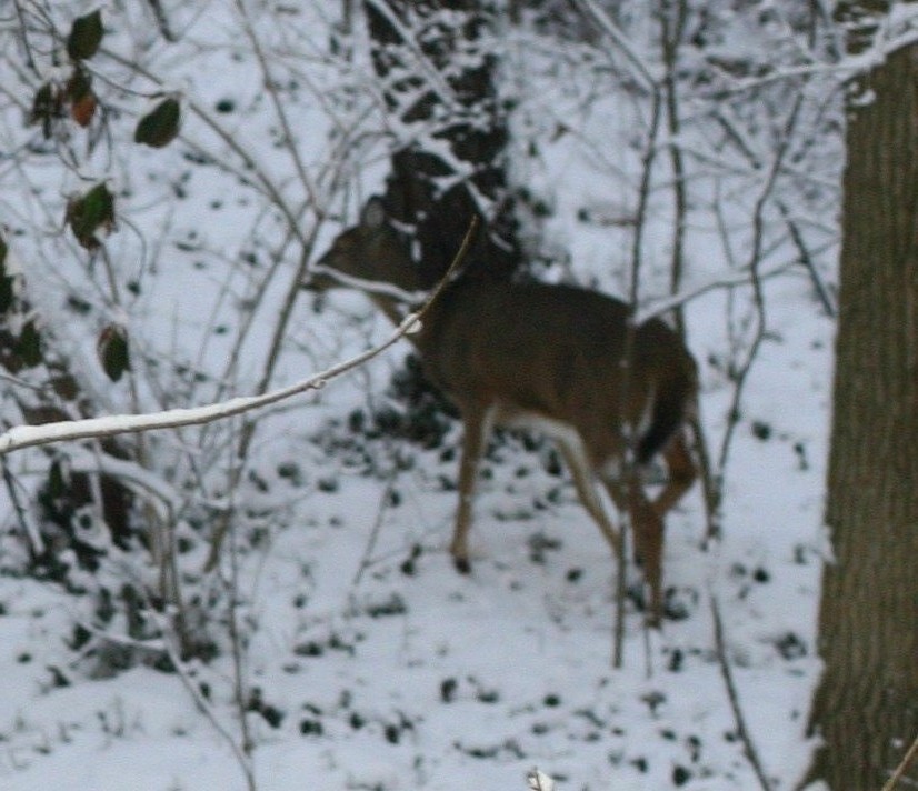 Then on Wednesday, Pete and I took our favorite snowy walk into Walhalla Ravine. We took that way to get to an oak tree on the other side of Indianola that Pete wanted to photograph to show that the stream used to be on both sides on the street. The setting was absolutely stunning, with the snow clinging to the bushes and even the smallest plants. How one small snowflake sticks to a tiny, thin twig always fascinates me. Then, as we were walking, Pete said, “Deer!” At first, I thought he was calling me (although “Dear” isn’t his most often used term of endearment