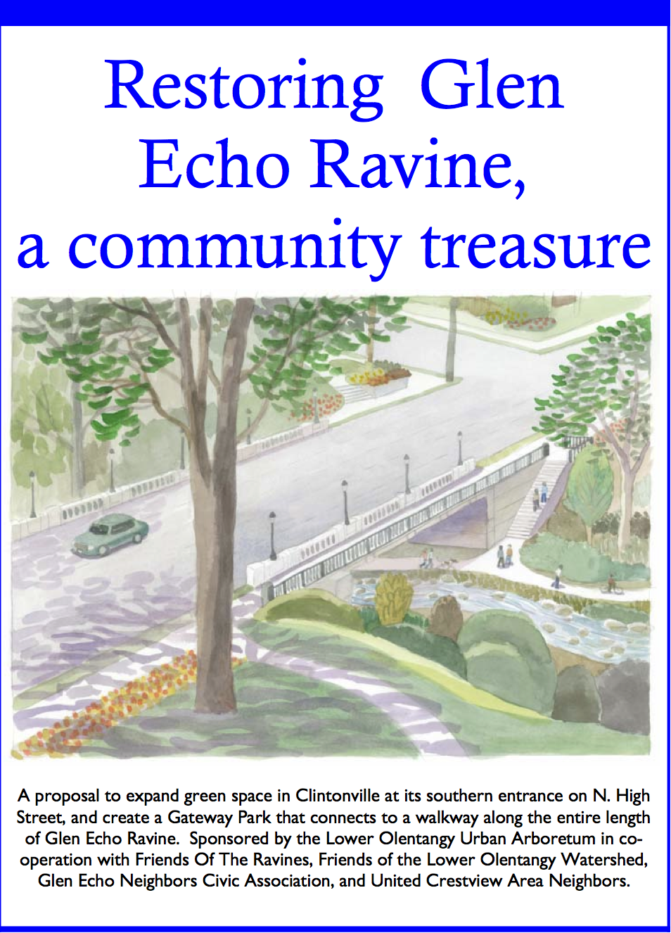 Rendition of High St. over Glen Echo Ravine looking south-east towards the Portal Park and Arcadia Ave. intersection. The former White Castle site is “day lighted” exposing the Ravine and Run.