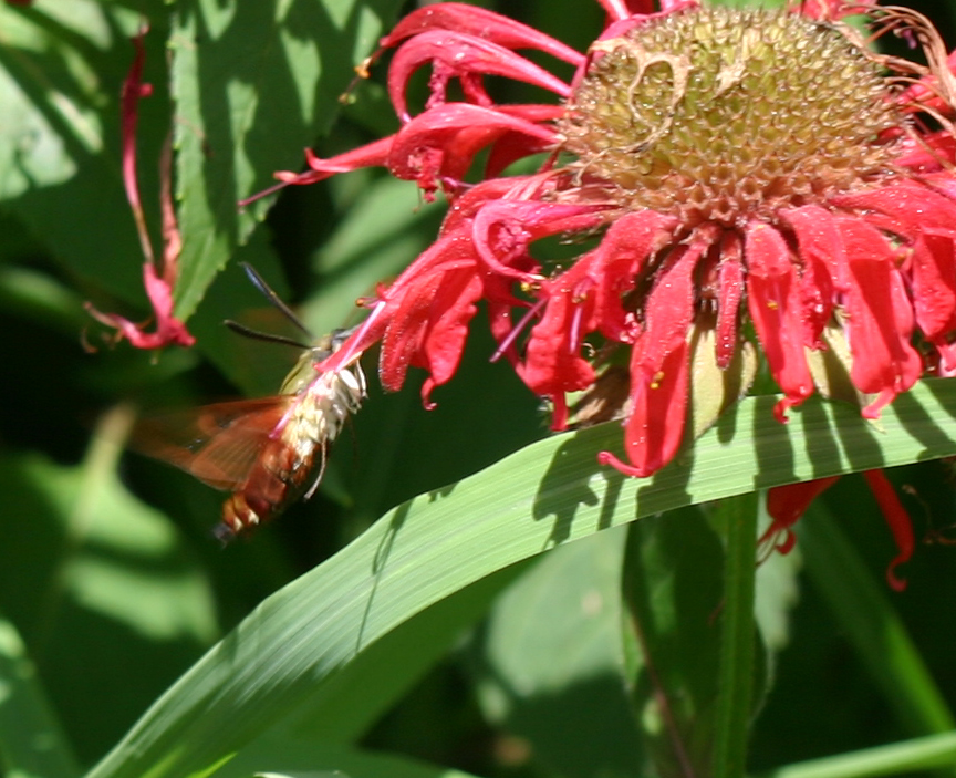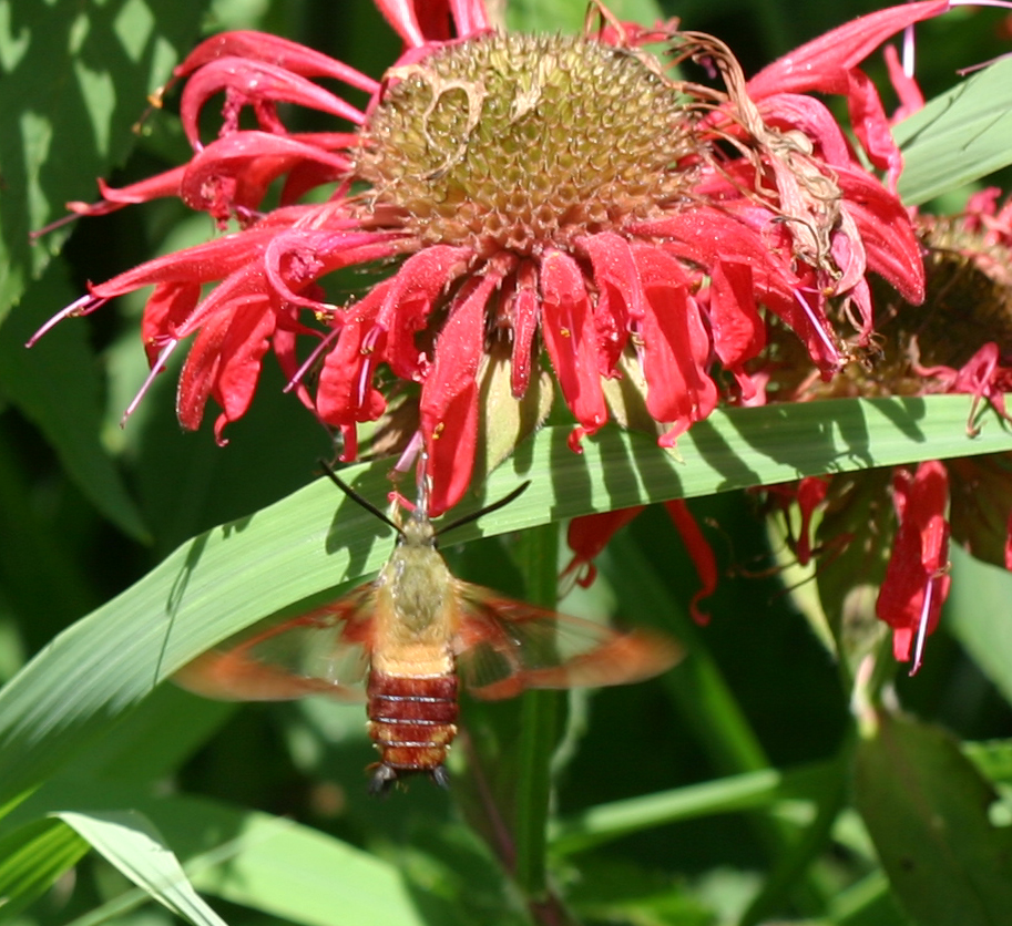 For those of you who are wondering, the Latin name is Hemaris thysbe (Fabricius, 1775). The insect has a range from Alaska and the Northwest Territories south through British Columbia to Oregon; east through the Great Plains and the Great Lakes area to Maine and Newfoundland; south to Florida and Texas. It’s really quite a beautiful thing to see.