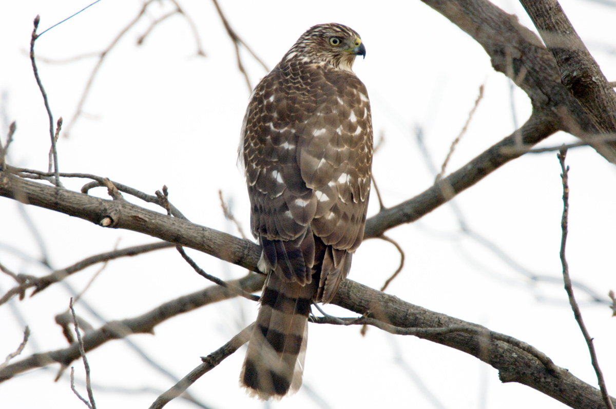 I’ve been seeing a lot of a hawk lately There’s one that’s living near Ohio State and the South Oval. I think it’s a Cooper’s hawk. An absolutely stunning bird with a cream breast and dark speckles. It is incredible fast, too. Then today, Pete and I travelled to Springfield, and saw perhaps four more. Finally, a hawk flew down across our street into the neighbor’s privet bush that was full of chirping sparrows. Sure enough, the hawk caught one. All was quiet for a few minutes, then birds when flying everywhere, the hawk in full flight after one of them. All succeeded in getting away; it was a marvel at how quickly the hawk could change direction to follow the sparrow.