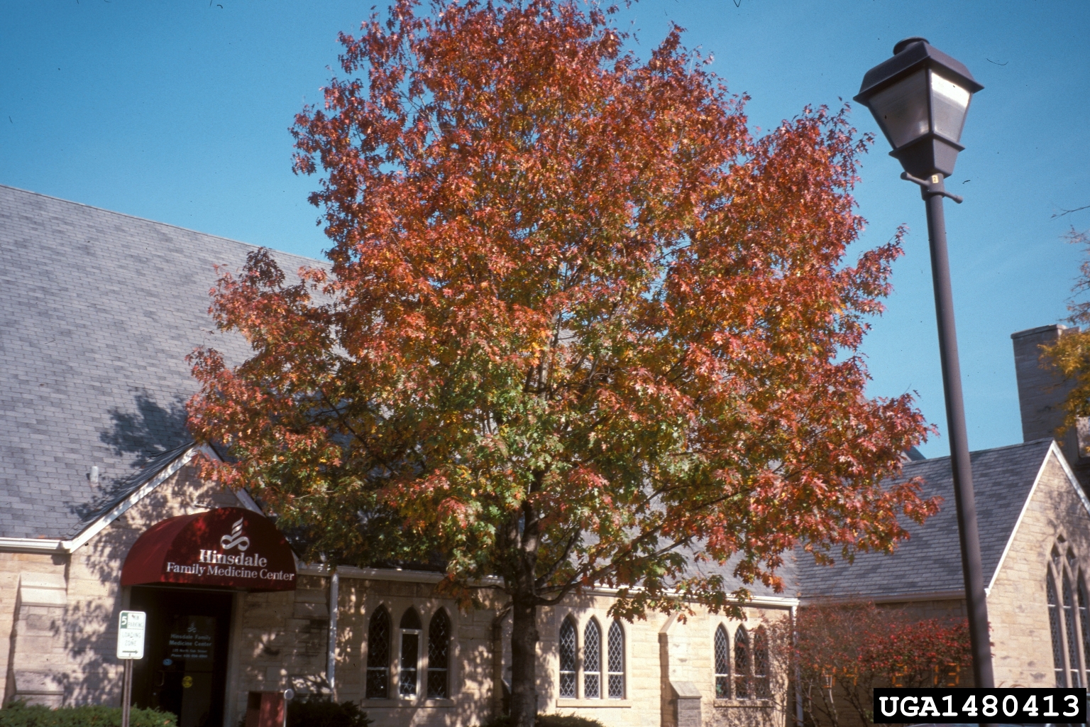Red Oak: An Ohio native tree that is fast growing, a 10-year-old Red Oak can be 20′ tall. The leaves turn yellow to red in the autumn. Many species of butterflies and moths use this tree as a host plant. This tree grows in full sun to part shade and grows to about 60′ tall.