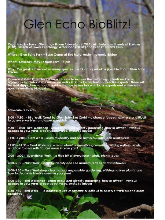 Organized by Lower Olentangy Urban Arboretum (LOUA) with help from Friends of Ravines (FOR), Friends of Lower Olentangy Watershed (FLOW) and Glen Echo Bird Club