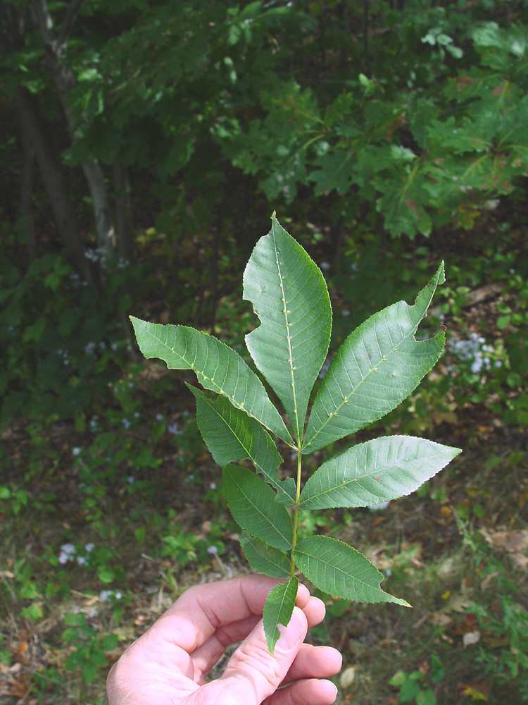 LEAF: Leaves are alternate, pinnately compound, up to 1 foot long, and usually display seven narrow, lance-shaped leaflets (ranging from seven to 11), with fine serrations on their margins. Spring and summer leaf color is medium green to dark green, while fall color is often golden.