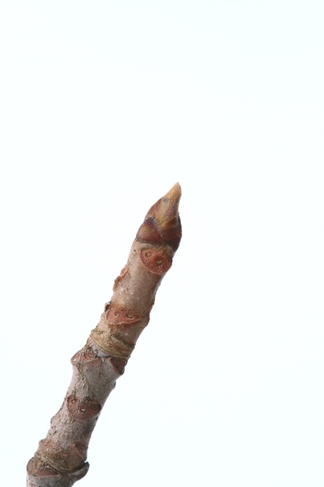 TWIGS AND BUDS: Small twigs are smooth, short, grayish to reddish brown; pith white, and diaphragmed. Leaf scars have three clearly visible bundle scars. Buds are round, pointed, and multi-colored, ¼ inch long.