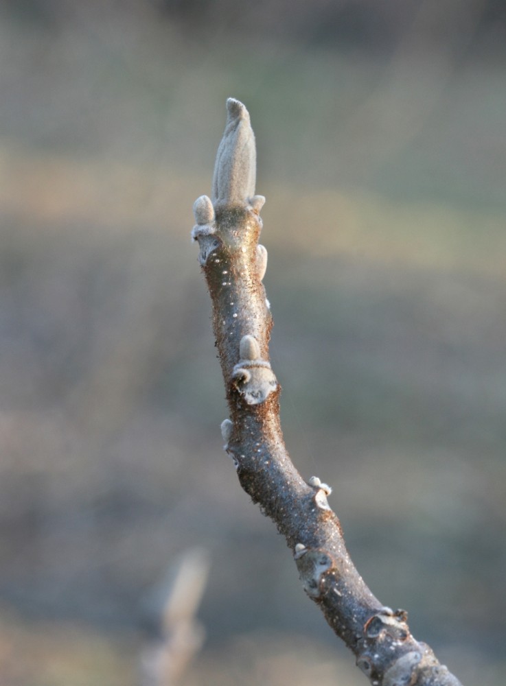 TWIGS AND BUDS: Twigs are greenish-gray to tan, stout with obvious hairiness, and have a dark brown chambered pith.