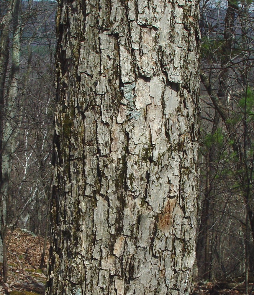 BARK: Immature bark is light gray and ranges from flaky to platy. Mature bark has ridges that break into light gray blocks and are separated from dark gray furrows. The bark flakes off easily when rubbed.