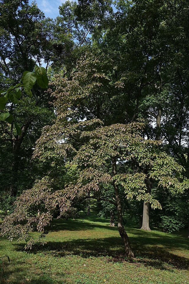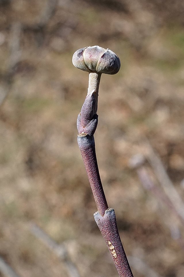 TWIGS AND BUDS: The bud is biscuit-shaped, glabrous and flattened, gray-green, at branch ends, and covered by 2 large silky scales