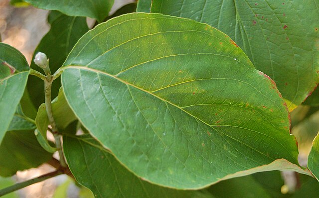 LEAF: Veins curve from the base of the leaf to the tip. Leaves are opposite, simple, oval to ovate, and dull green from above. The fall color is red to reddish purple.