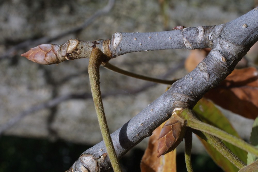 TWIGS AND BUDS: Dormant buds can resemble those of yellow buckeye, but up close they feature overlapping scales that resemble the keel of a boat. Large terminal buds are a good identifier of this tree. Twigs are stout and odorous when scratched; end branches typically curve upwards.