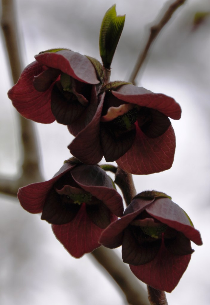 FLOWER: Pawpaw flowers bloom from March through May. Each branch bears few, but large, blossoms. These blooms droop downwards and are deep red in color.