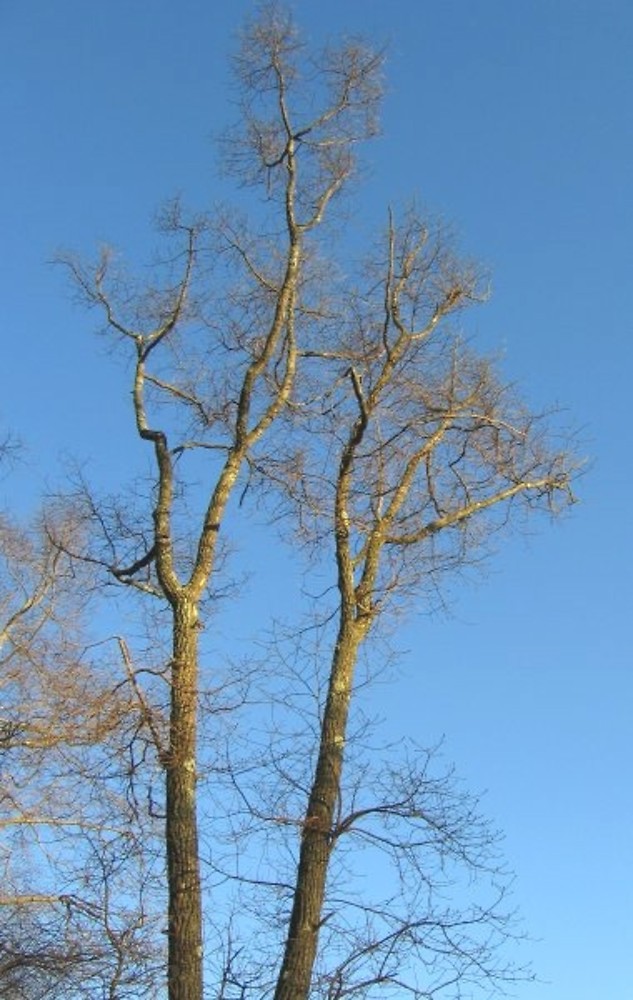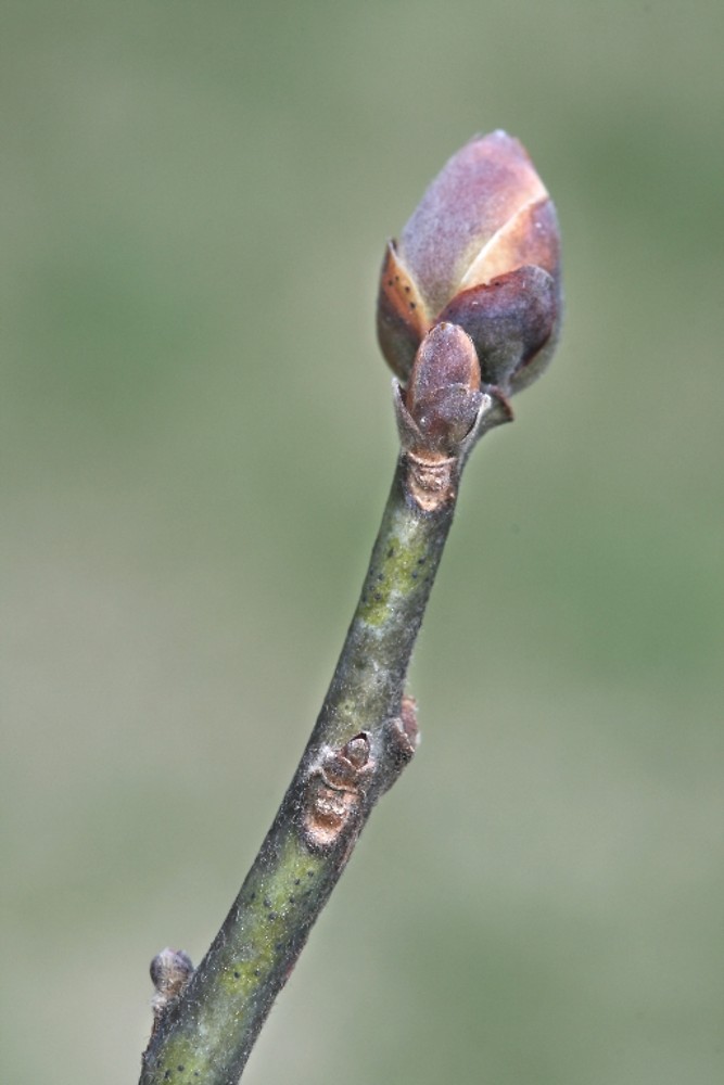 TWIGS AND BUDS: Young twigs are bright green, turning reddish in color as they grow, maintaining a smoother and shiny texture. Twigs have large white piths. Terminal buds are much larger than the lateral buds, with many loose scales.