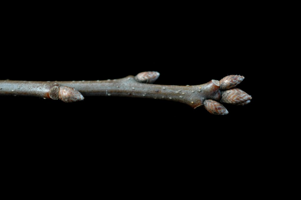 TWIGS AND BUDS: Olive-green, stout twigs terminate in a cluster of light-colored, smooth, or slightly fuzzy buds.
