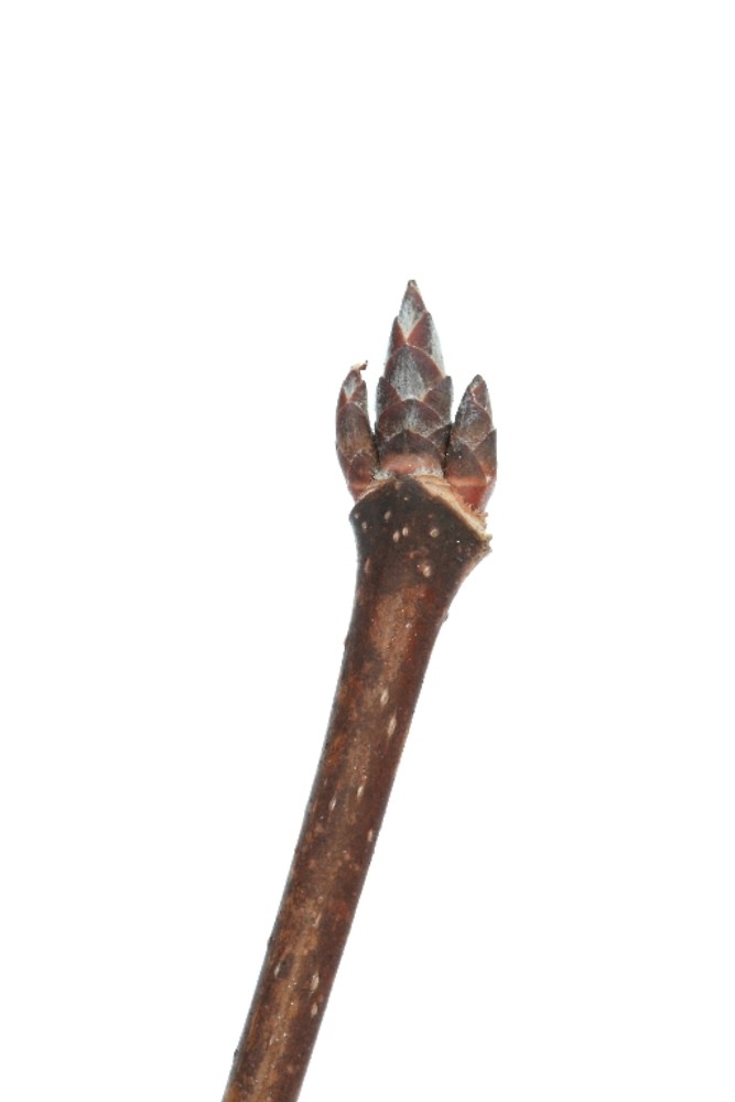 TWIGS AND BUDS: Buds are sharply pointed with tightly overlapping dark brown-blackish scales. Twigs are light brown to gray, with opposite branching.